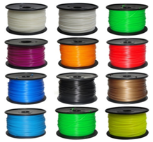 桌面機耗材主要有ABS和PLA,耗材均是直徑1.75mm的卷裝線材,單卷線材重量1kg。兩種材料均有20多種顏色可選擇,包括白色、乳白色、黃色、紅色、黑色、灰色、綠色、橙色等等 ABS :強度高、韌性好、易于加工成型的熱塑型高分子材料。 PLA :能生物降解外,生物相容性、光澤度、透明性、手感和耐熱性較好。